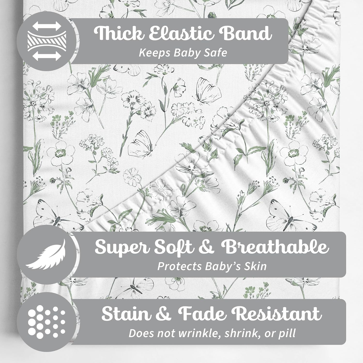 🦋 INCREDIBLY SOFT & BEAUTIFUL – This beautiful custom pattern is printed on the most luxuriously soft cotton blend. Thicker elastic and deeper pockets ensure that our crib mattress sheet will NOT slip off the mattress. You’ll feel the incredibly soft, yet stretchy and silky material as you pull the sheets and snug, creating a safe and soothing space for your baby to sleep.