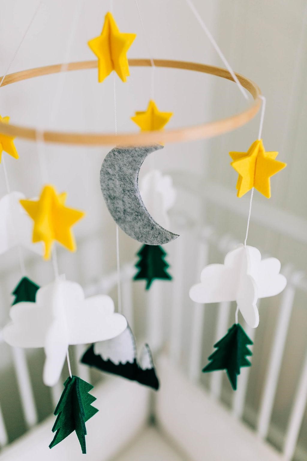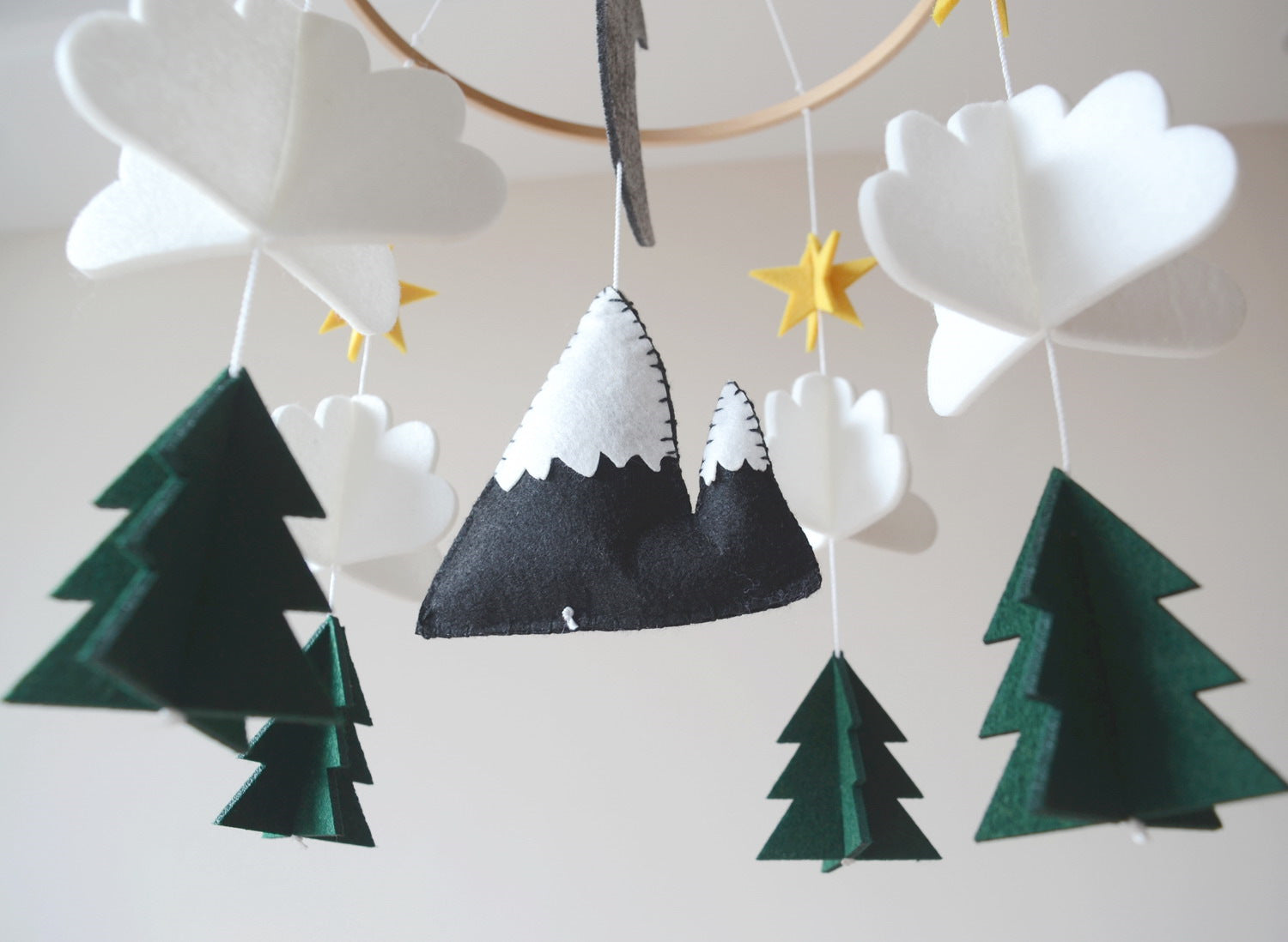 ③ Pieces are adjustable! If your mobile is hanging too low for your crib, simply move the pieces up on the string, tie a knot and cut off excess string.