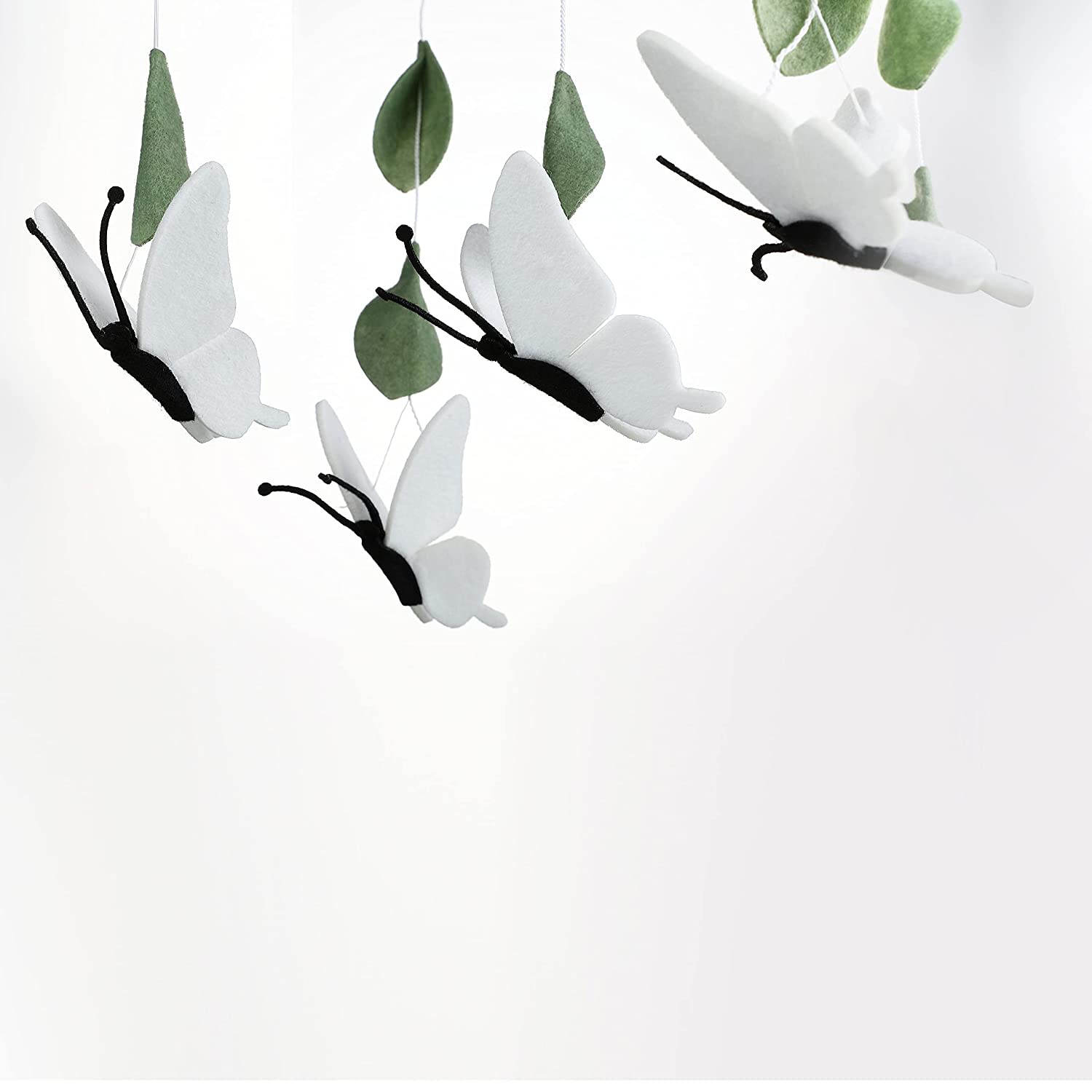 Delicate butterflies in shades of white and black gently float underneath sage green leaves, lulling your little one to sleep.
